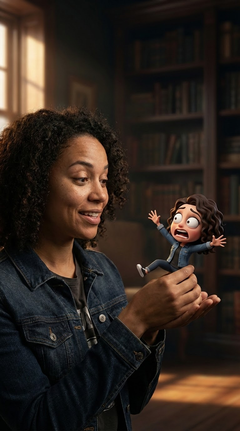 NANO BANANA PROУльтрареалистичный портрет женщины по исходной фотографии. Она держит рядом миниатюрную 3D копию себя и смотрит на неё с удивлением и лёгким юмором, на фоне драматического кинематографического света.