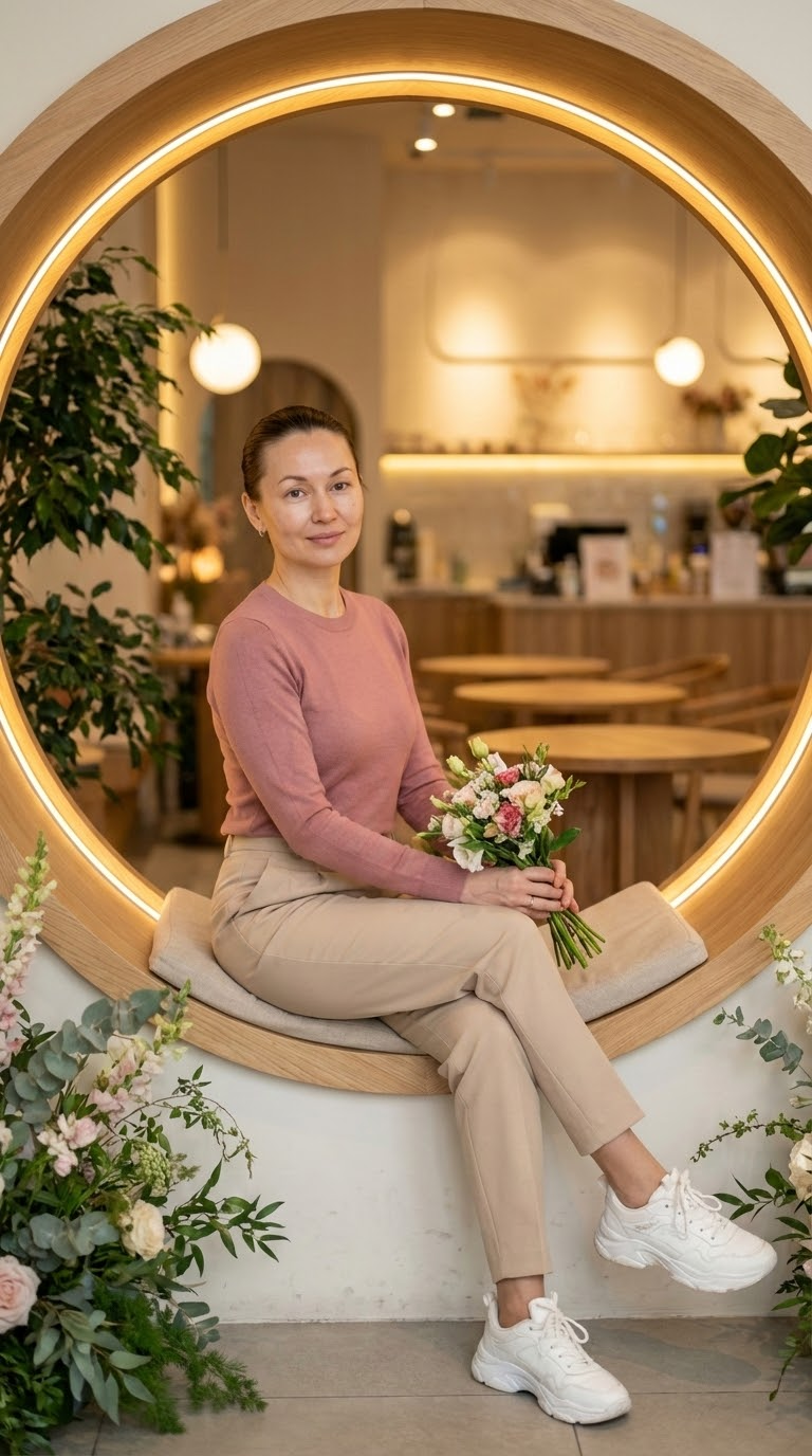 NANO BANANA PROУльтрареалистичный портрет лица взрослого в современном кафе. Рамная композиция с теплым LED-светом, естественной позой и минимализмом — без ретуши.