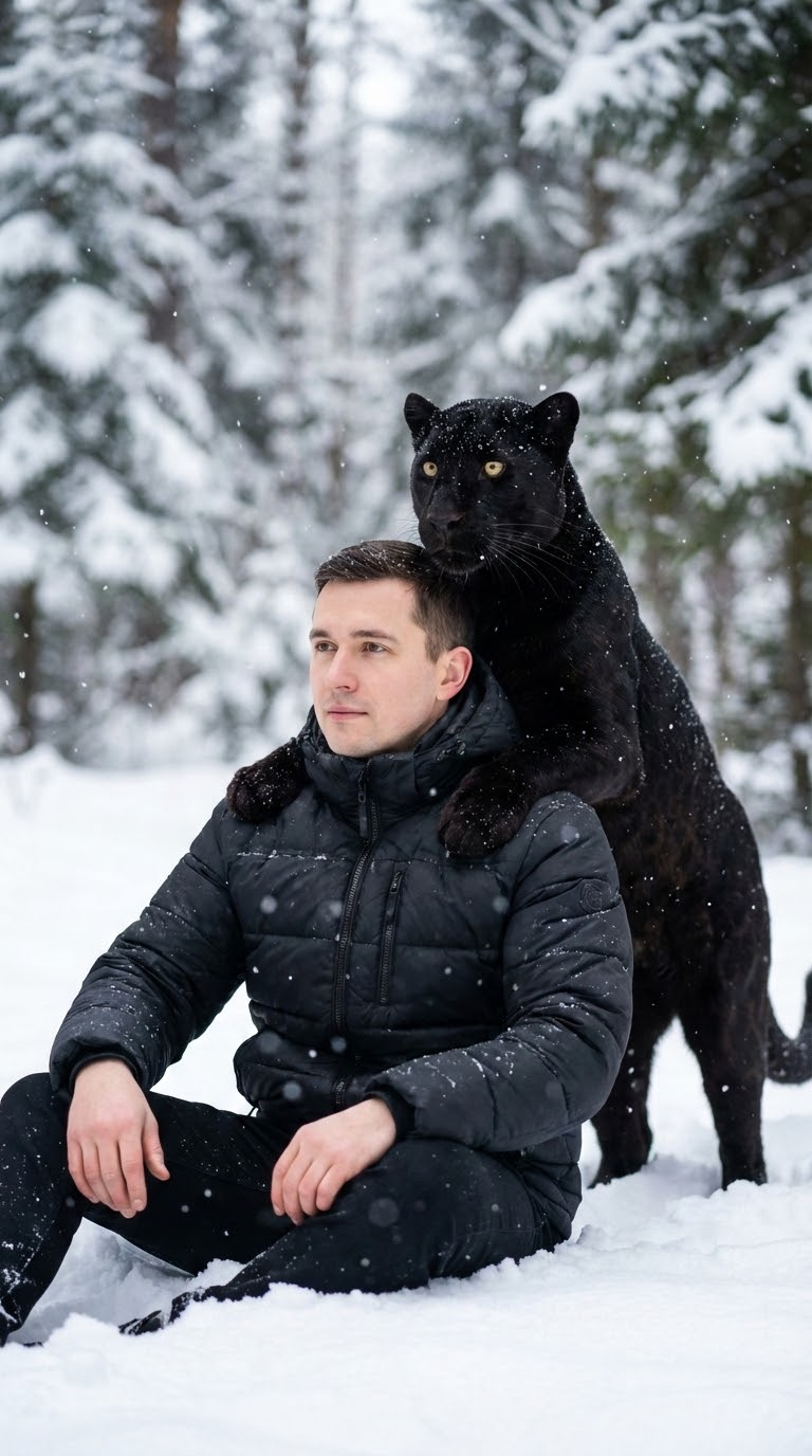 NANO BANANA PROФотореалистичный кадр в 8K: мужчина в черной пуховой куртке в глубоком снегу, позади пантера на плечах. Мягкий дневной свет подчеркивает текстуру меха и ткани.