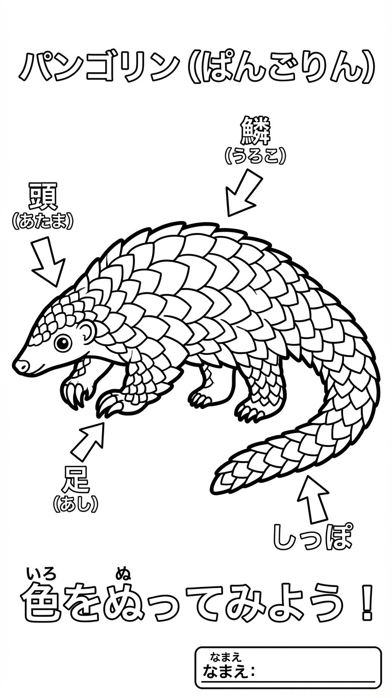 NANO BANANA PROИз диаграммы животного создается страница раскраски для детей. Упрощенная диаграмма и Ruby-текст (furigana) добавлены для упрощения чтения.