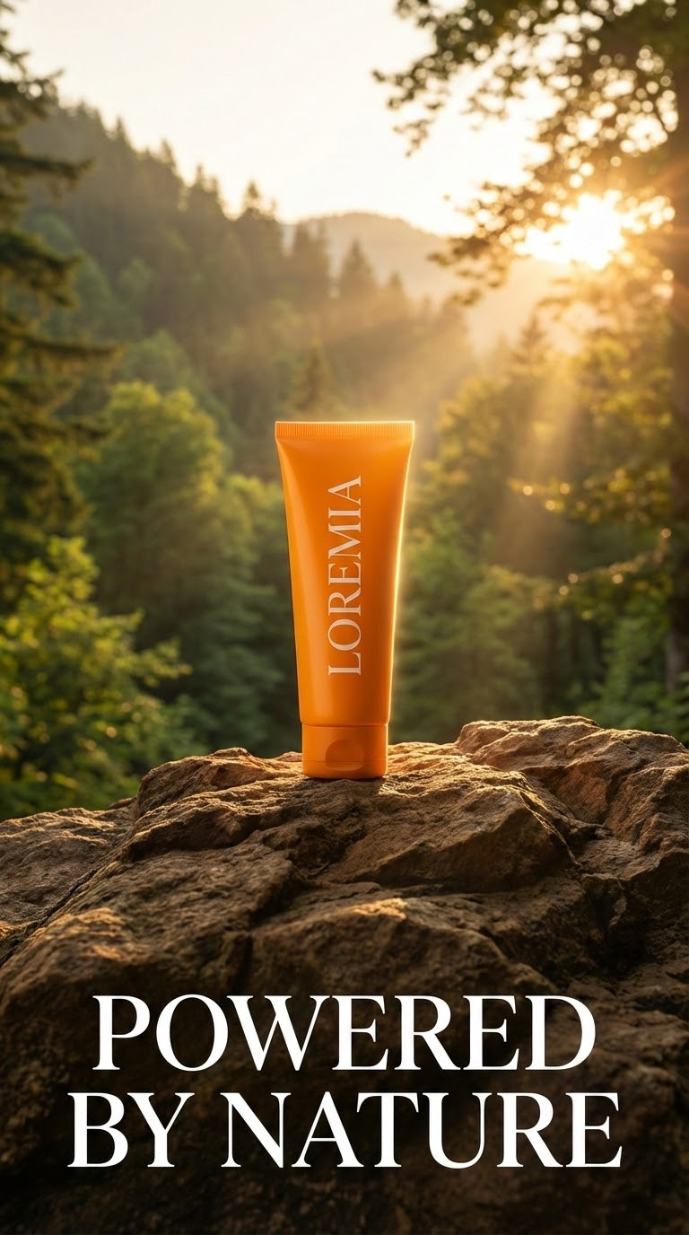 NANO BANANA PROКинематографическая съемка косметики: яркий оранжевый тюбик на камне. Фон — зелёный лес в золотой час, тёплый свет и контурное освещение подчеркивают текст на упаковке.