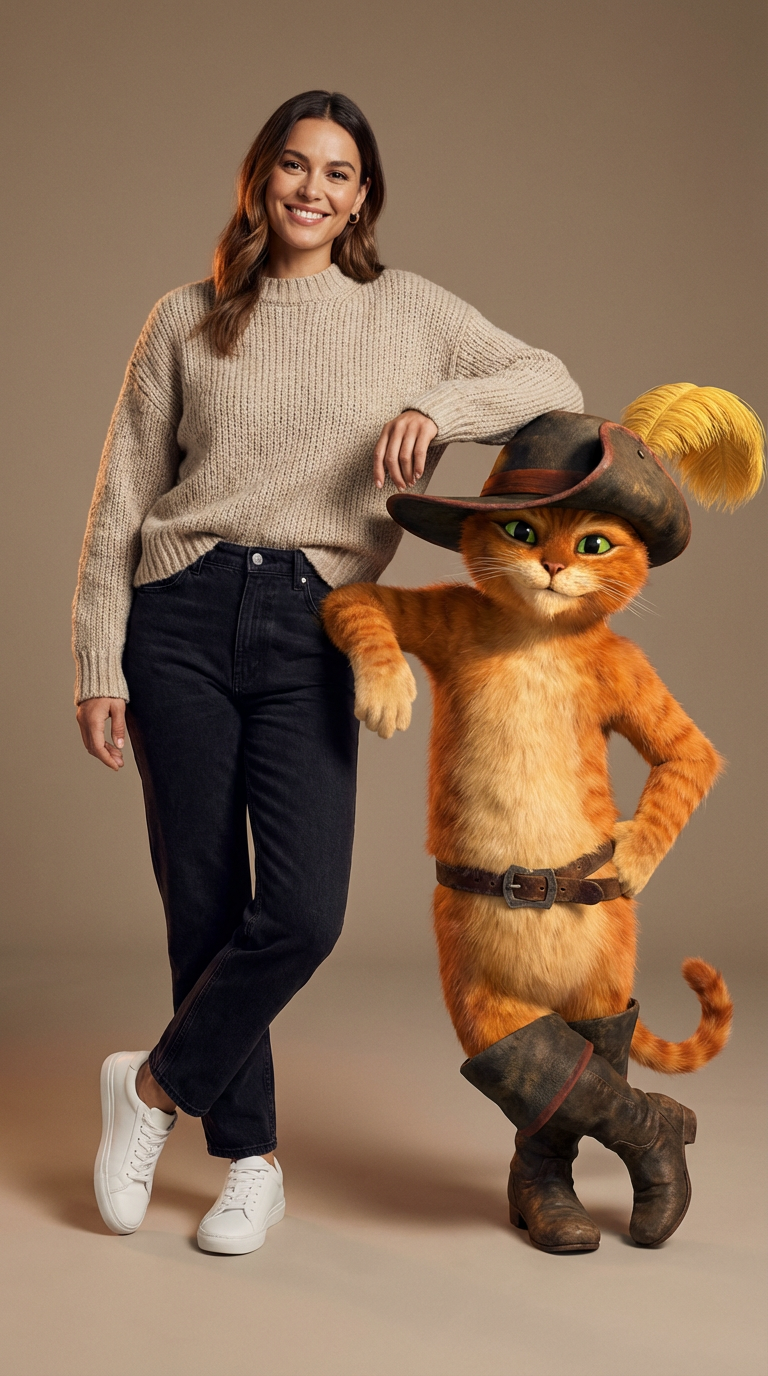 NANO BANANA PROРасслабленный премиум-портрет в студии с реальной моделью и реалистичным персонажем кота в сапогах. Мягкое освещение, тёплый фон и детальная фактура шерсти создают гармоничный и стильный образ.