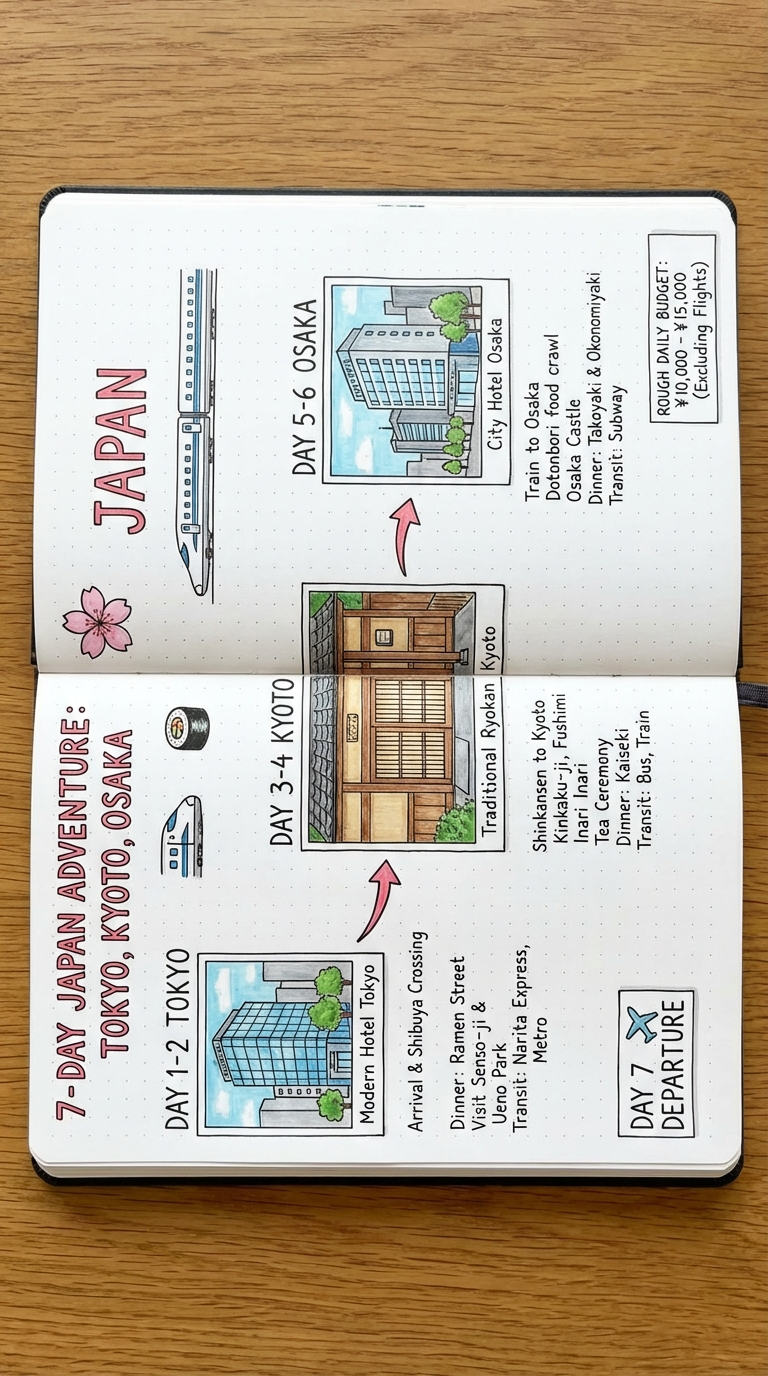 NANO BANANA PROПланируете путешествие по Японии? Подробный 7-дневный маршрут по Токио, Киото и Осака с достопримечательностями, проживанием и ориентировочным дневным бюджетом.