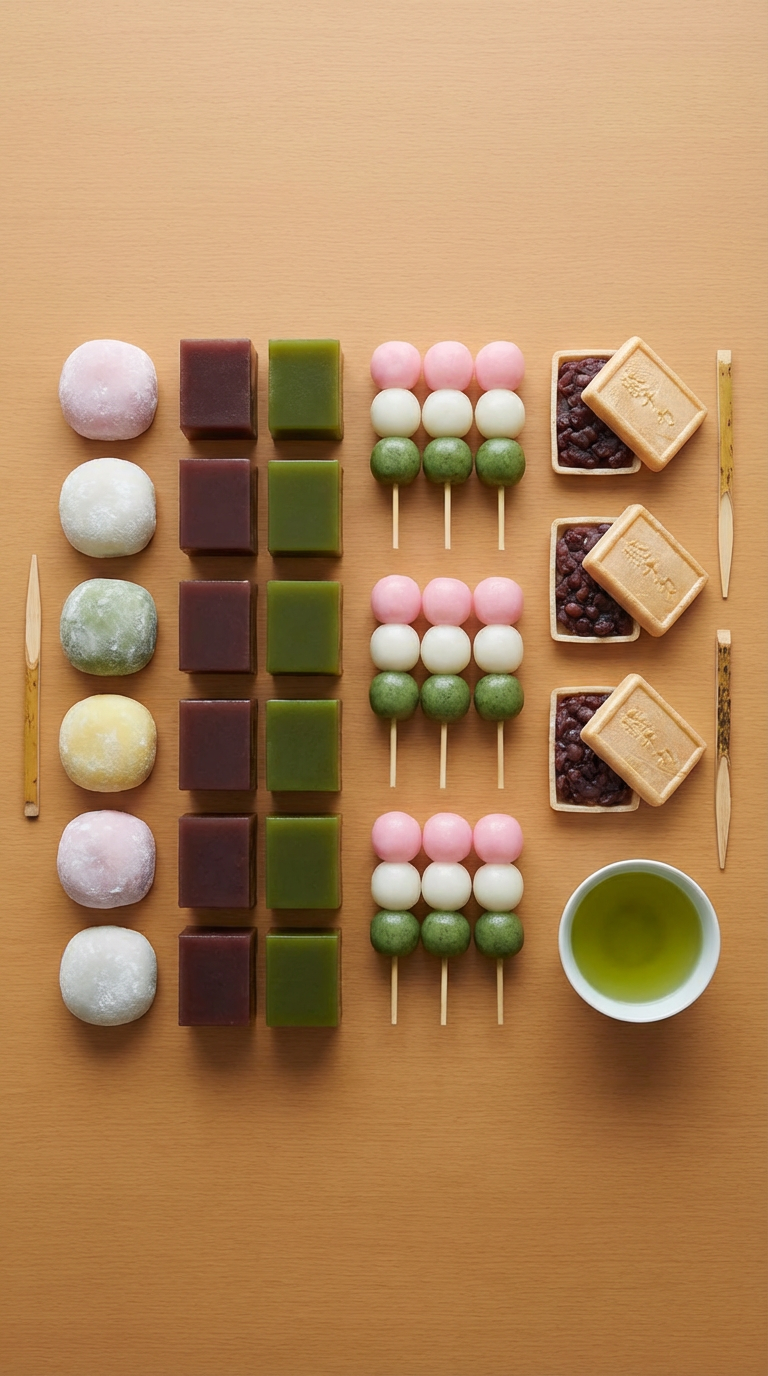 NANO BANANA PROИзображение японских десертов даифуку йокан данго монако в разных формах. Включены круглые квадратные треугольные и прямоугольные варианты, акцент на визуальную подачу.