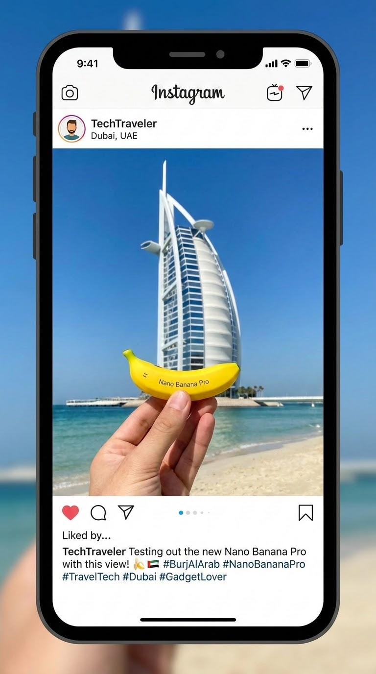 NANO BANANA PROИнстаграм стиль кадра с реалистичным изображением Бурдж Аль Араб. Фокус на ярких огнях города и роскошной архитектуре ночью.