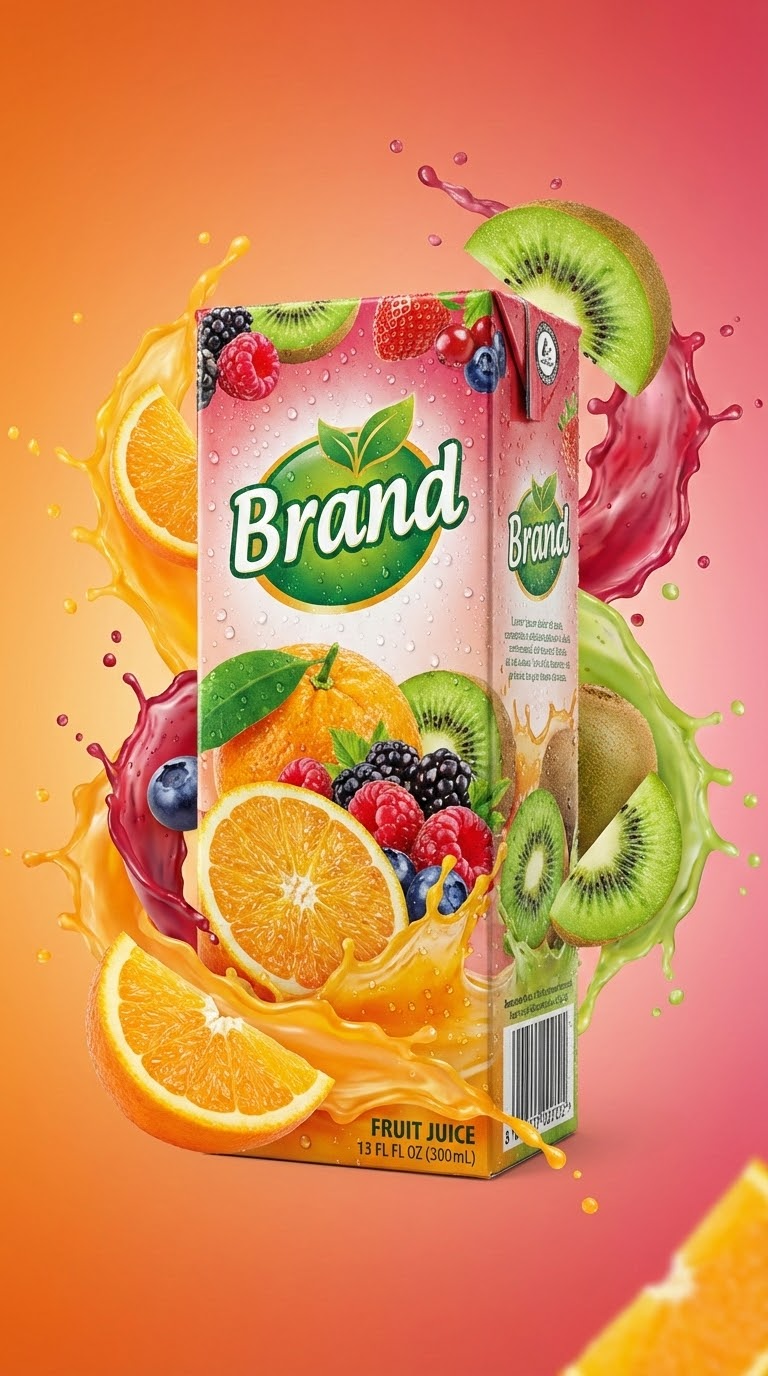NANO BANANA PROКоммерческая фотосъёмка упаковки фруктового сока с ярким графическим дизайном. Фон - цветной градиент, динамические брызги и капли конденсации на блестящей поверхности.