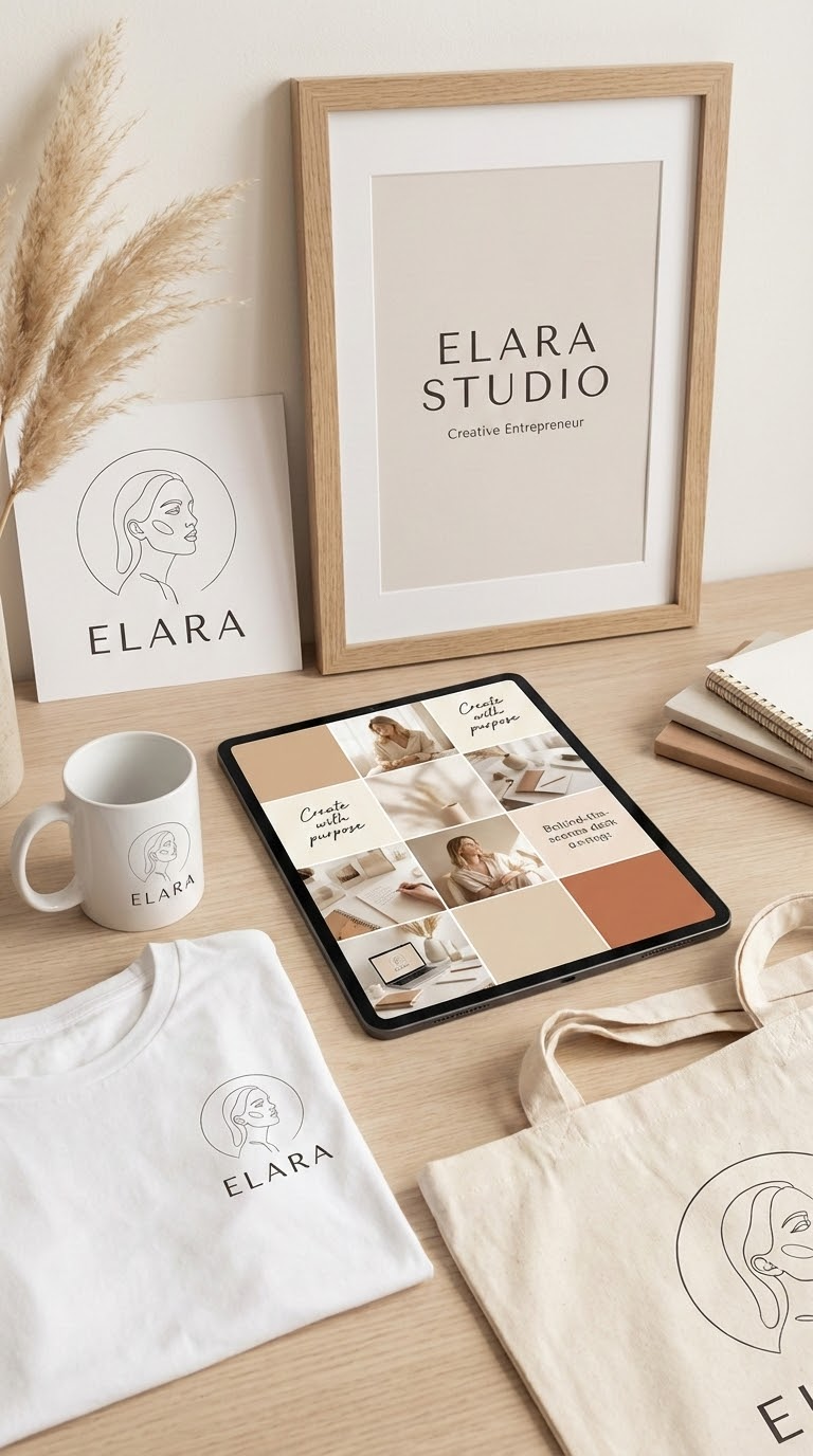 NANO BANANA PROМинималистичный макет персонального бренда: единая айдентика, логотип и шрифты на нейтральном фоне. Включает шаблоны постов, мерч и материалы.