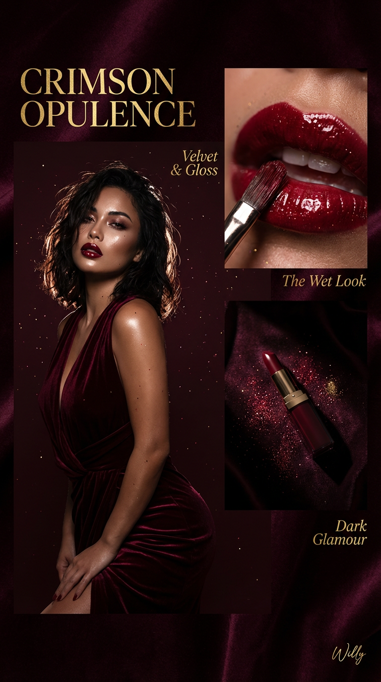 NANO BANANA PROРедакционная съемка в глубокой бордовой палитре с бархатом и драматичным светом. Главный образ - гламурная евразийская женщина в бархатном платье с мокрыми глянцевыми губами. Дополнительные кадры демонстрируют текстуру помады.
