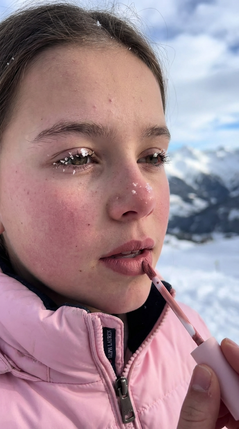 NANO BANANA PROНа изображении молодая девушка наносит матовую розовую помаду в горном зимнем пейзаже. Акцент на естественном макияже губ и детальной фактуре кожи.