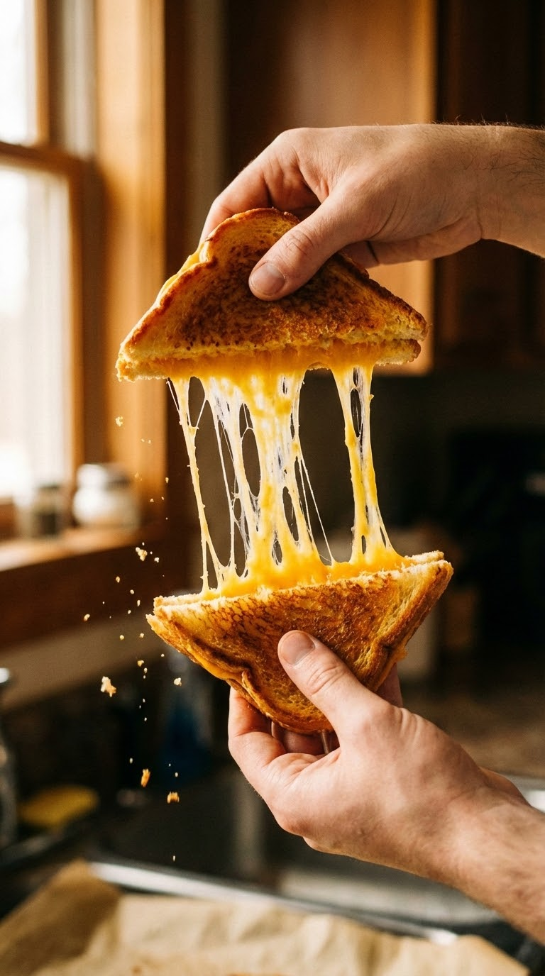 NANO BANANA PROДинамичная кулинарная сцена в тёплом свете. Расплавленный чеддер тянется между половинками поджаренного хлеба, золотистая корочка и уют кадра.