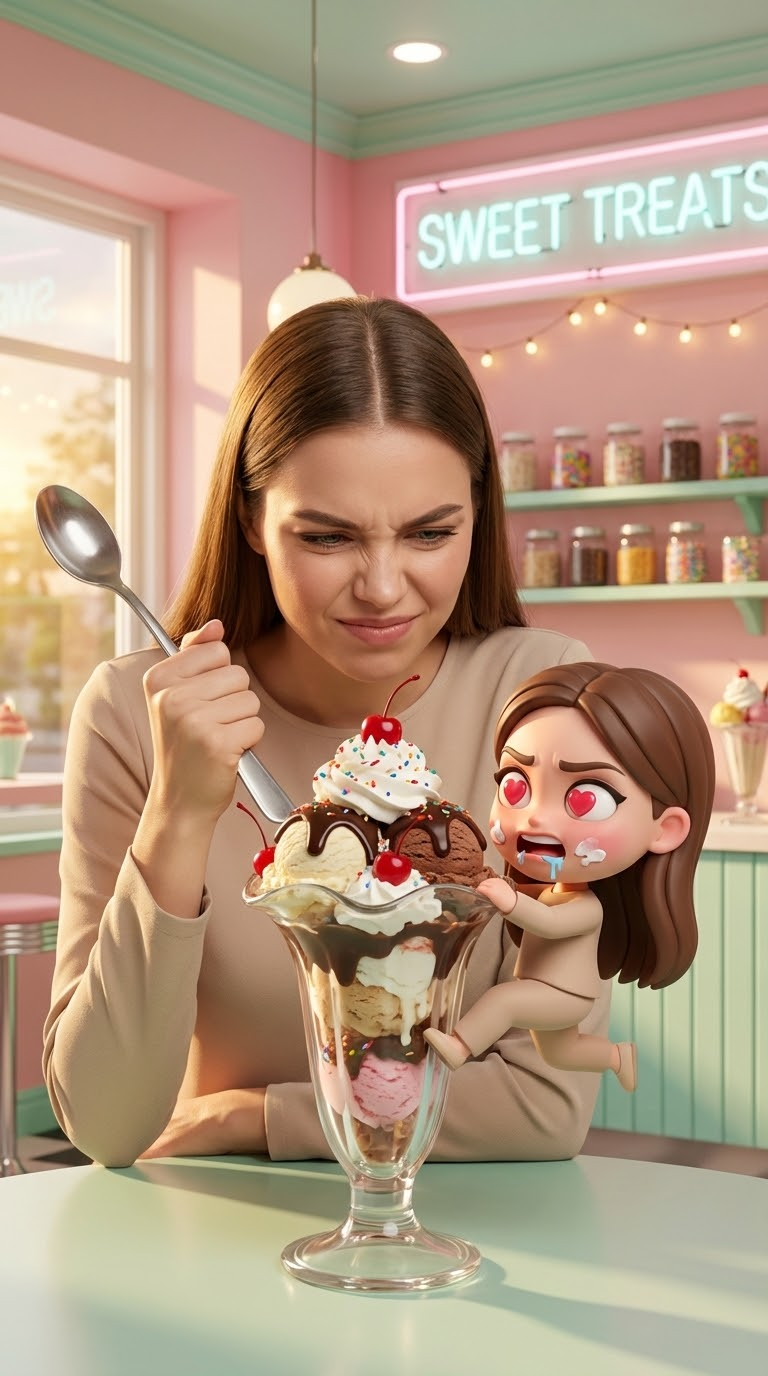 NANO BANANA PROУльтра‑реалистичная женщина в кафе с мороженым держит ложку, обороняясь от гигантского десерта. На столе чиби‑версия цепляется за стекло, выражая концентрацию.