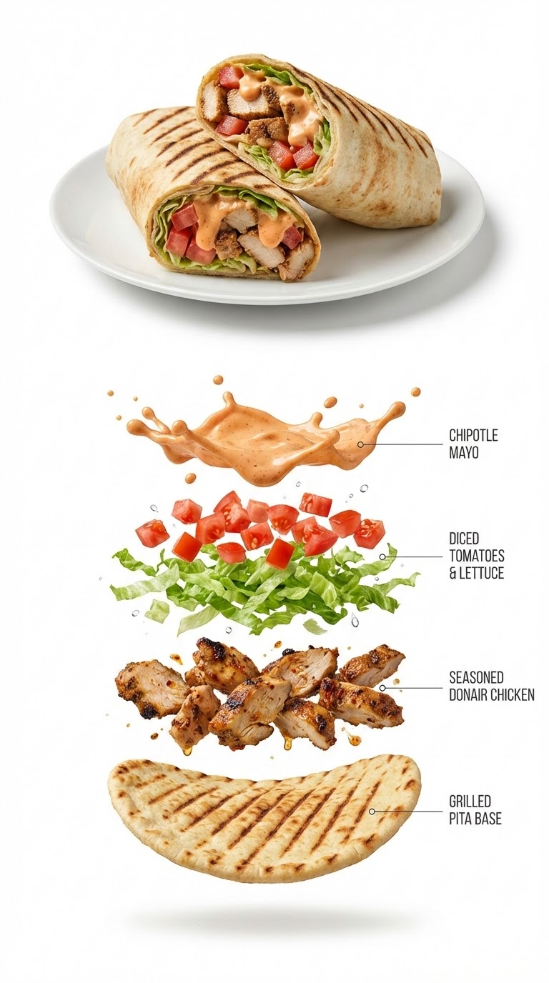 NANO BANANA PROДва варианта промптов для шаурмы: реалистичное фото на белом фоне и эксплозивная инфографика ингредиентов. В кадре куриная шаурма в лаваше с чипотле майонезом, томатами и зеленью.