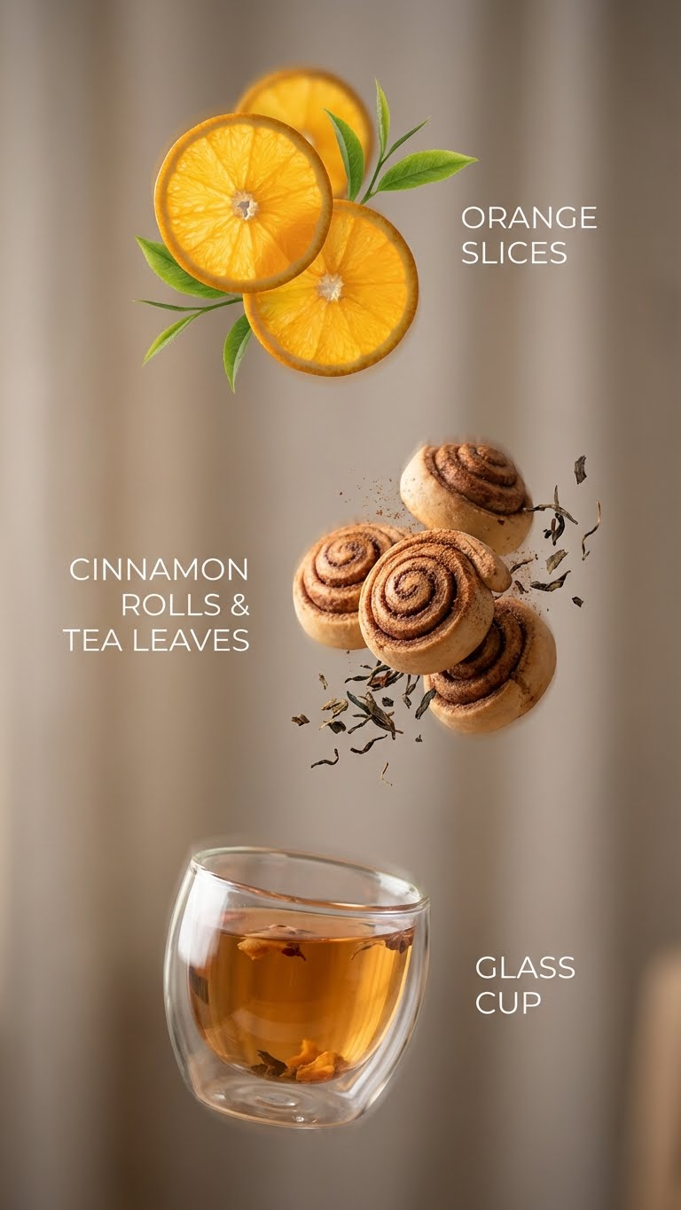 NANO BANANA PROВертикальная композиция с элементами в воздухе: апельсиновые дольки, корица и чай парят над стеклянной чашкой. Минималистичные подписи рядом дополняют кадр.