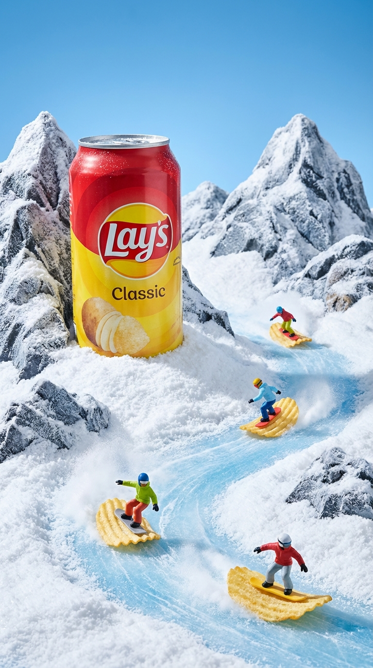 NANO BANANA PROСюрреалистичная рекламная сцена: чипсы на снегу превращаются в гору, миниатюрные сноубордисты скользят по льду. Контраст освещения и премиум стиль подчеркивают креативность кадра.