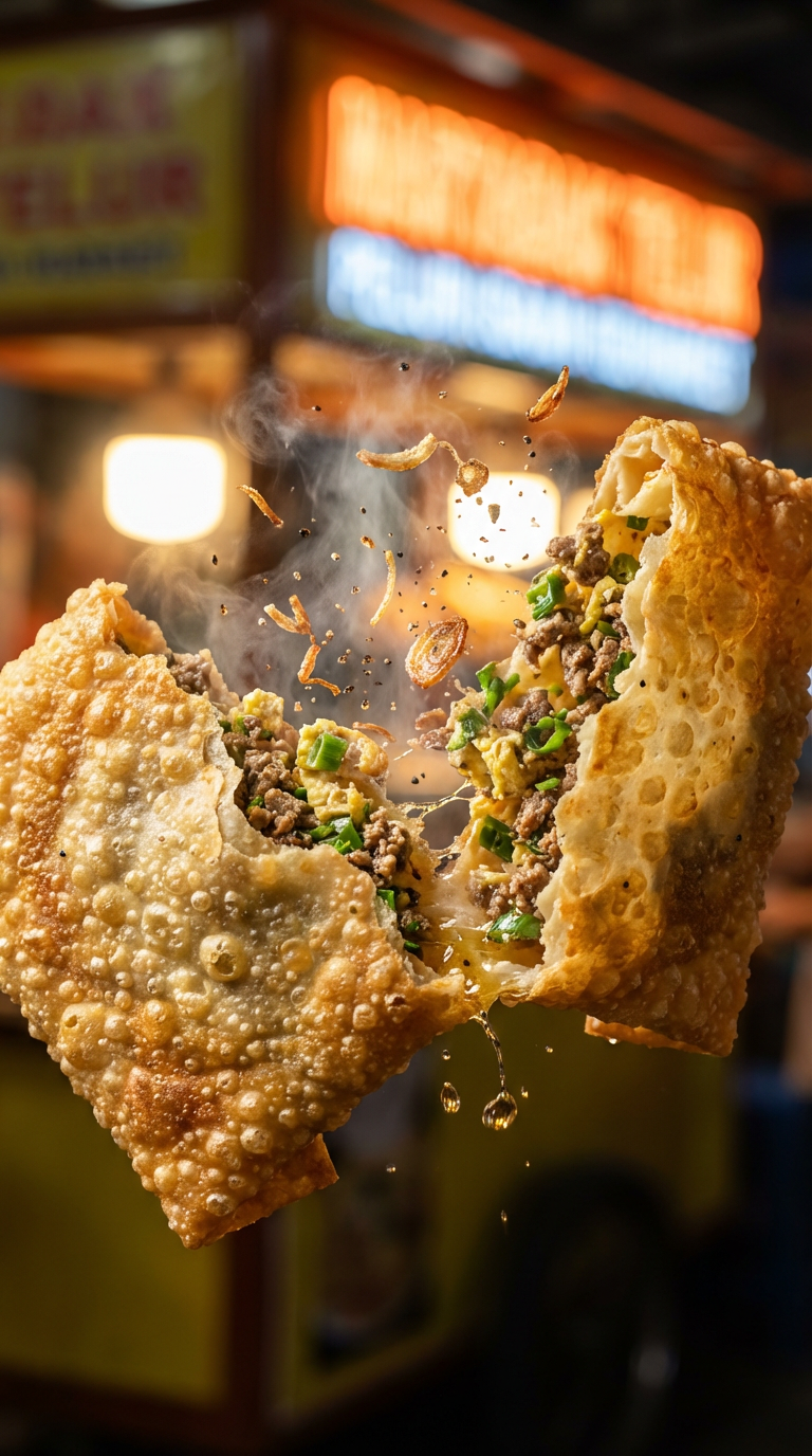 NANO BANANA PROМакро-съемка хрустящей корочки martabak telur с начинкой из говядины. В кадре пар над начинкой, блеск масла и тёплый уличный свет создают драматическую текстуру.