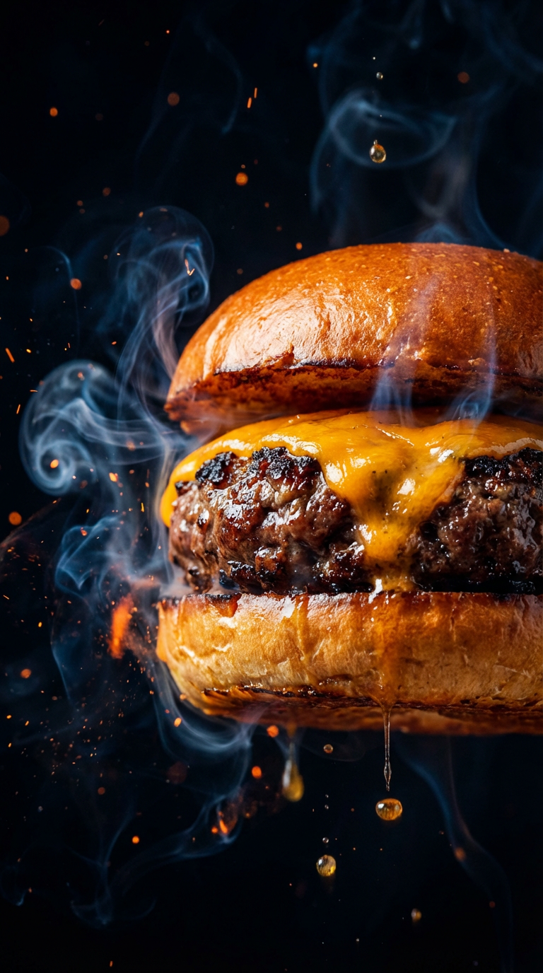 NANO BANANA PROКрупноплановый глянцевый чизбургер в кинематографическом стиле. Макро-съёмка подчёркивает блеск сыра, сочную котлету и дымную атмосферу, создавая драматичную подачу.