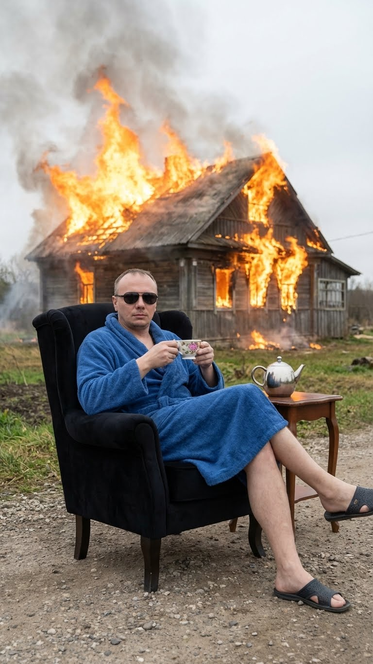 NANO BANANA PROДокументальная фотография: молодой мужчина с короткими коричневыми волосами и очками сидит на грунтовой дороге, держит чашку. Позади горит деревянный дом, дым в небе; справа серебряный чайник.