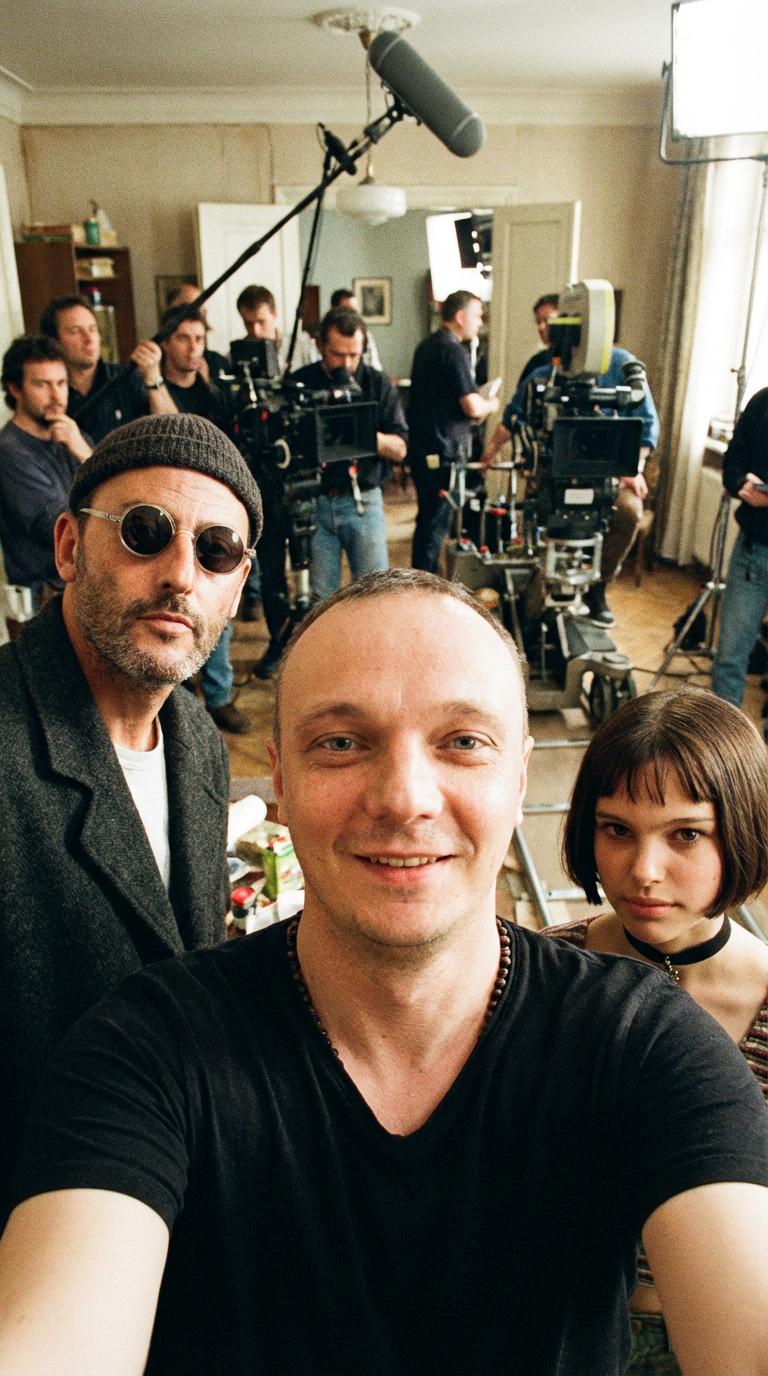 NANO BANANA PROНа переднем плане: Леон, молодая Матильда и женщина из референса делают селфи. Фон — реальная съемочная площадка фильма Léon: The Professional с командой, реквизитом и камерами.