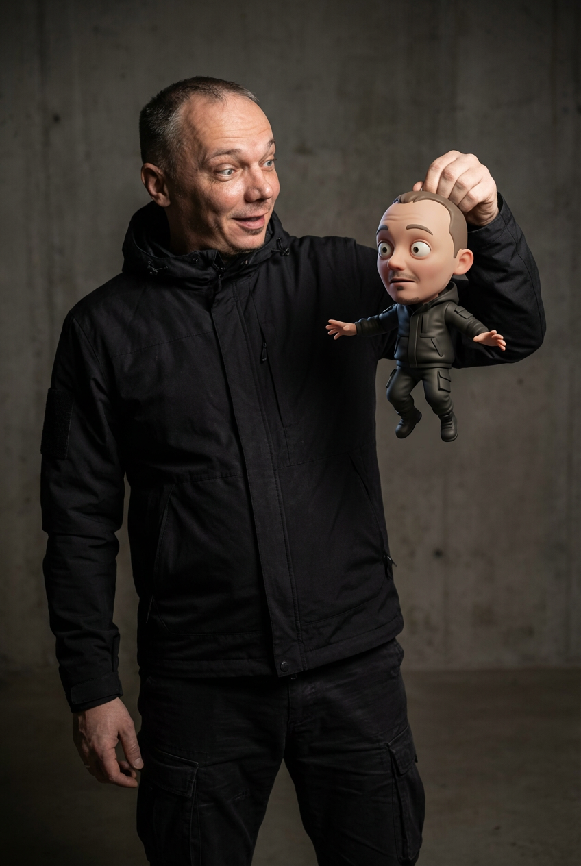 NANO BANANA PROПрикольная фотосессия мужчиный который поднял свою копию в миниатюрном виде