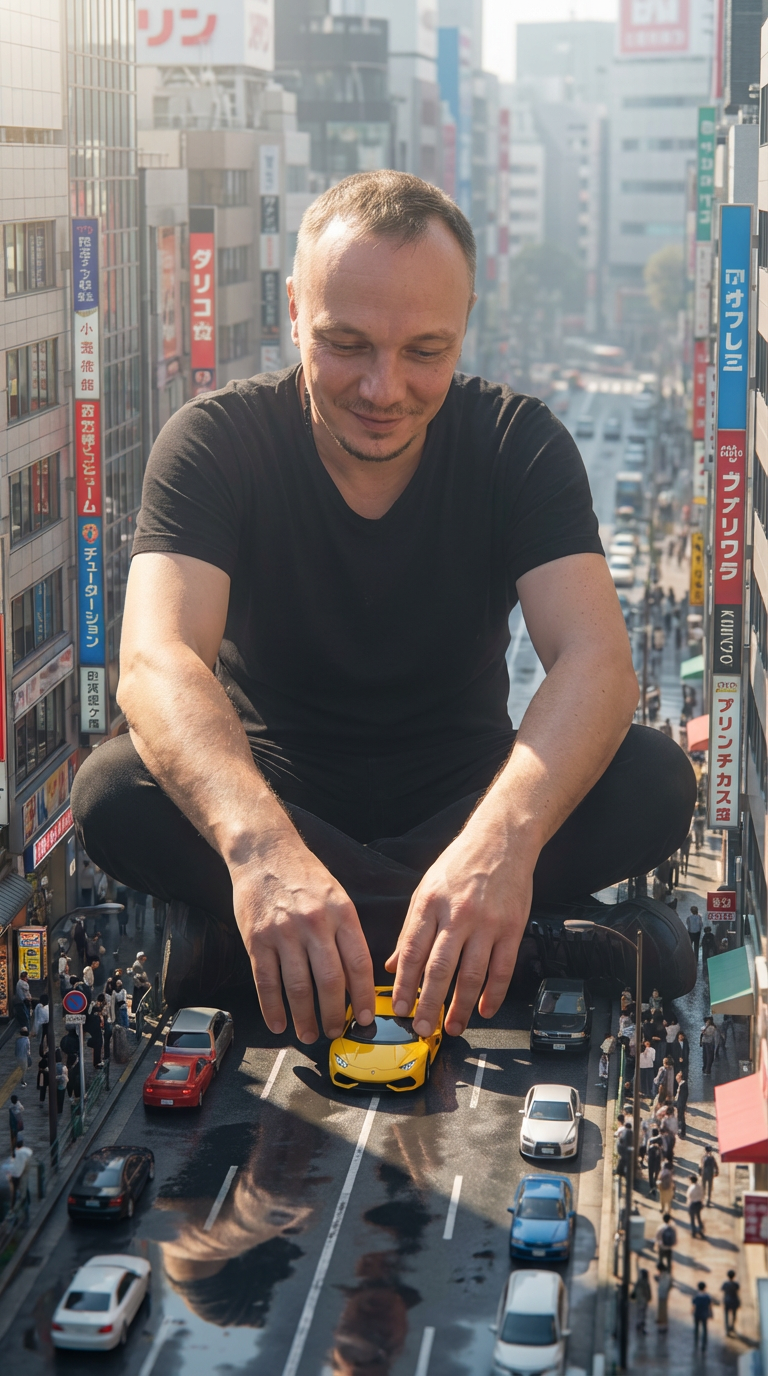 NANO BANANA PROФотореалистичный кадр сверху: гигантский корейская мужчина в стильной куртке над Токио управляет маленьким автомобилем, взаимодействуя с зданиями и дорожными знаками.
