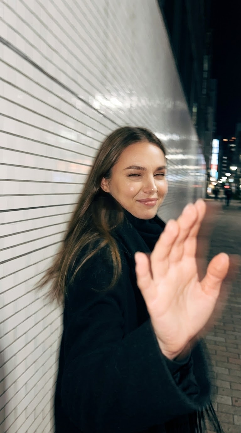 NANO BANANA PROРеалистичный промпт для ночной уличной съемки в Токио на смартфоне. Фокус на candid момент, естественные жесты и движение, свет и тени.