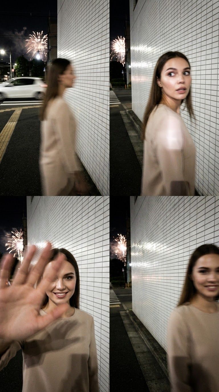 NANO BANANA PROУльтрареалистичный промпт для четырехкадрового коллажа, снятого смартфоном на ночной улице Токио. В кадре движения камеры, размытость и яркие блики; лица неразборчивы. Сцена вымышленная, не предназначенная для идентификации лиц.