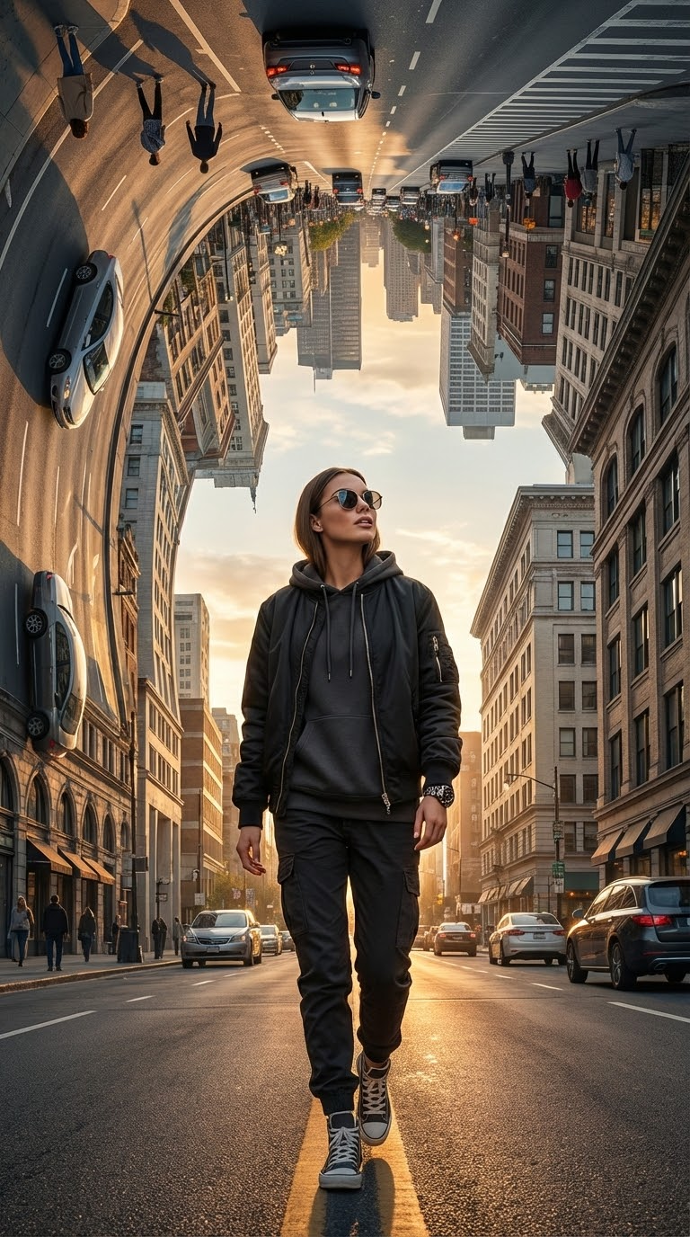 NANO BANANA PROГиперреалистичная художественная работа в 8K с героем в стильном уличном образе. Город изгибается и парит над улицей, создавая сюрреалистическую сцену.