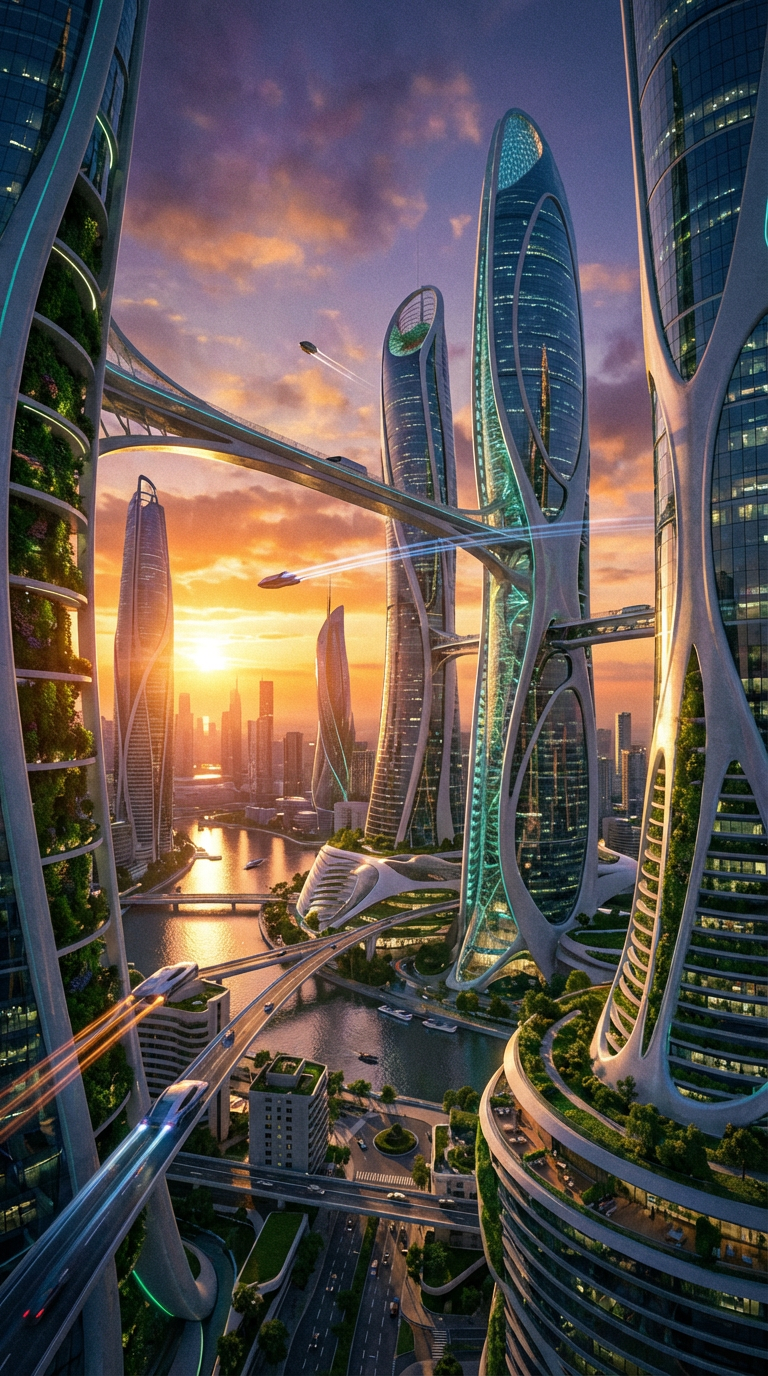 NANO BANANA PROФутуристический городской пейзаж на закате с неоновыми огнями и небоскрёбами. Этот промпт подходит для создания визуальных концептов городов будущего.