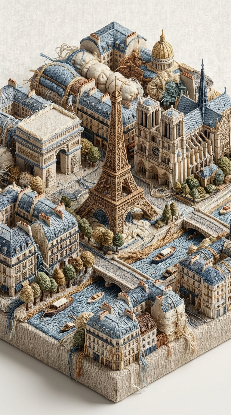 NANO BANANA PROУникальная текстильная панорама города, фасады из нитей. Архитектура и история переданы через 3D вышивку на льняной ткани, создавая ощущение ручной работы и тканевой скульптуры.