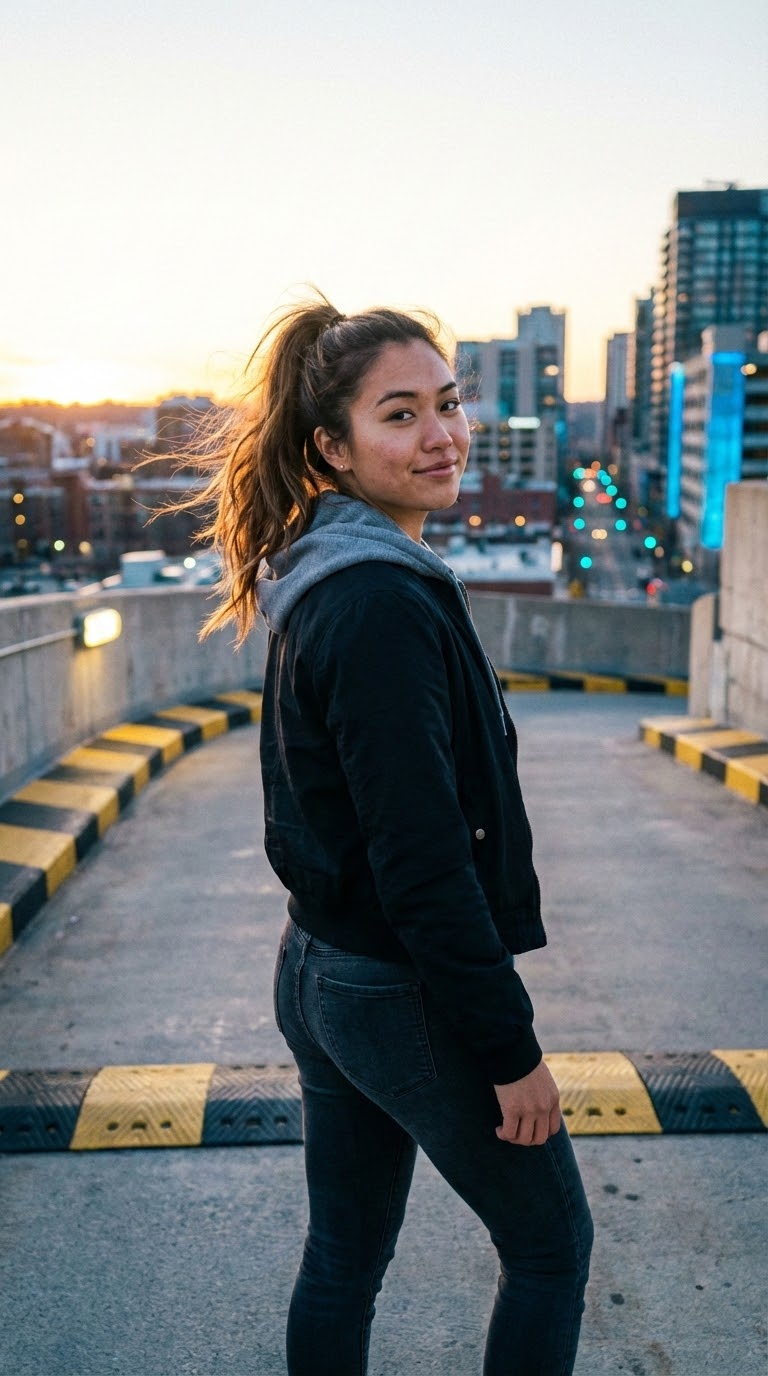 NANO BANANA PROУличная съемка на крыше с естественной кожей и мягким светом заката. Стиль raw реализм, кадр пойман спонтанно. Без постановочных поз и чрезмерной обработки.