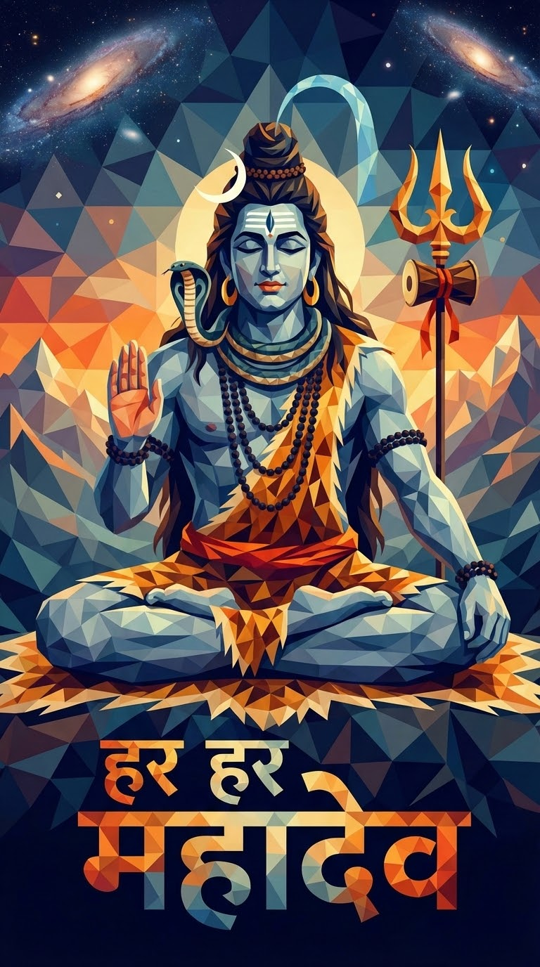 NANO BANANA PROИзображение Шивы, созданное из треугольников в едином цветовом стиле. Геометрическая стилизация с текстом 'हर हर महावadev', написанным треугольниками.