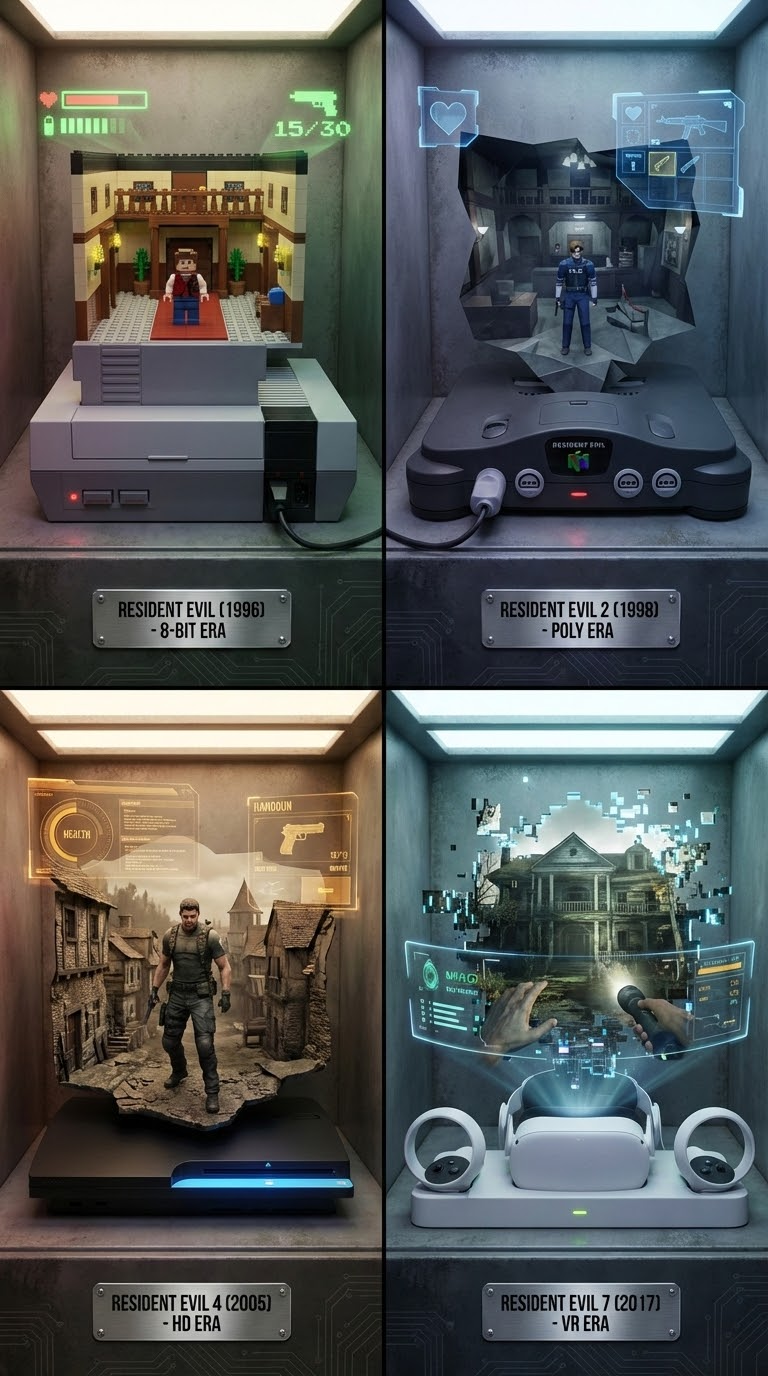 NANO BANANA PROПромпт исследует эволюцию видеоигр через четыре эпохи: 8-бит, 64-бит, HD и VR. Визуализация оформлена как 2x2 графика с физическими консолями и уникальными мирами.
