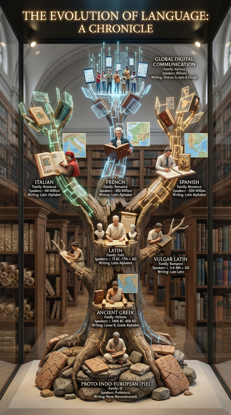NANO BANANA PROВертикальное дерево эволюции письма от праиндоевропейского корня к современным системам письма. В кадре миниатюрные писцы и тексты, карты распространения и материалы.