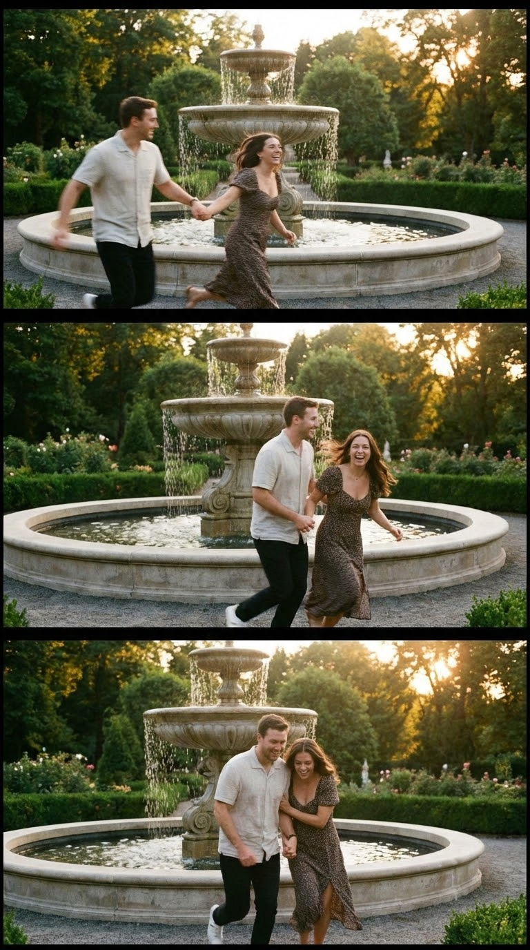NANO BANANA PROКинематографичная история любви в саду: пара гуляет вокруг фонтана в романтичном движении камеры. Взгляды и улыбки передают игривую нежность.