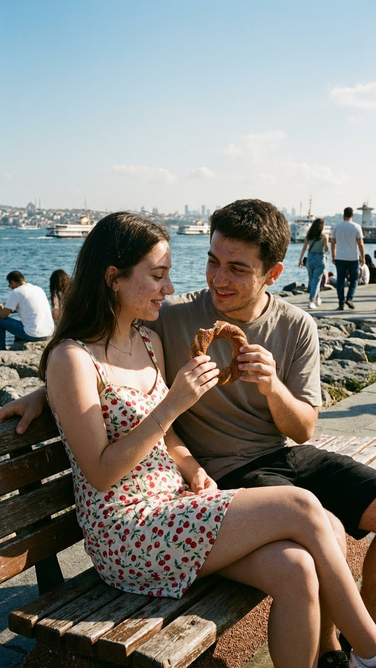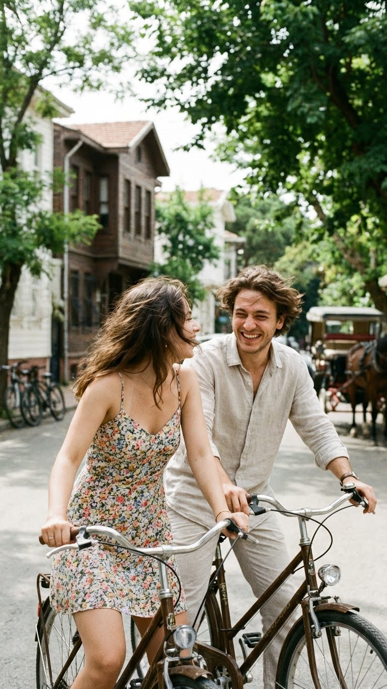 NANO BANANA PROПортретная сцена уличной романтики на острове Бююкада. Непостановочная съемка молодой пары на велосипедах, естественный дневной свет и повседневная атмосфера улиц.
