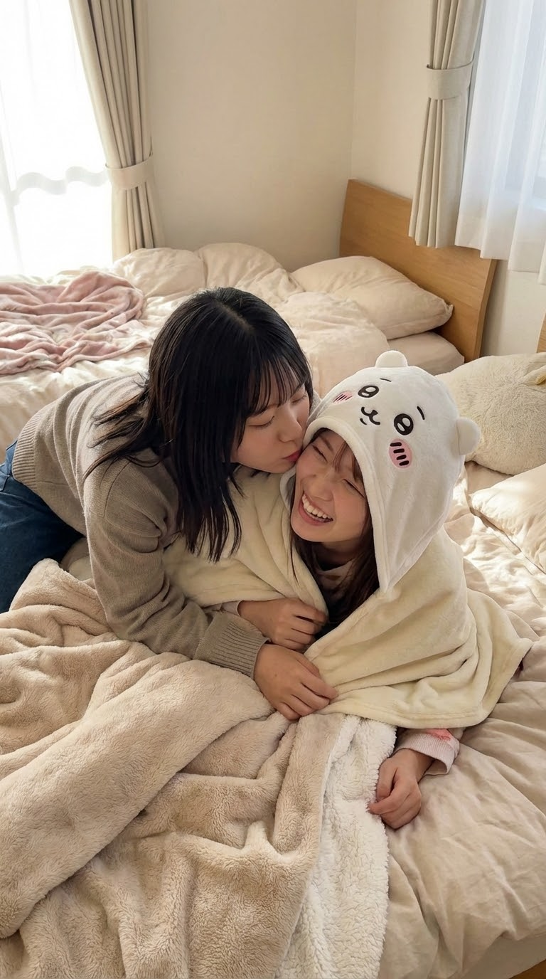 NANO BANANA PROРомантическая сцена поцелуя между героями в кадре, передающая нежность и близость. Сцена содержит момент на кровати и эмоциональное взаимодействие персонажей.
