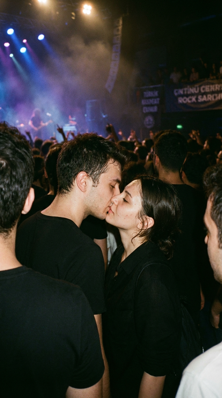 NANO BANANA PROЖивой кадр романтического момента на концерте, без постановки и ретуши. Фокус на глазах пары и естественные эмоции в толпе, создавая документальный настрой.