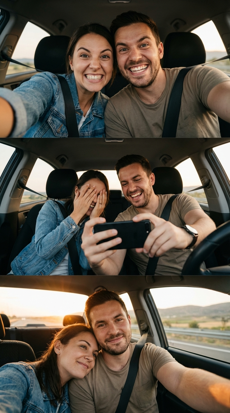 NANO BANANA PROТриптих из трёх кадров с парой в автомобиле на дороге. Естественные позы, мягкое дневное освещение и дружелюбная атмосфера поездки.