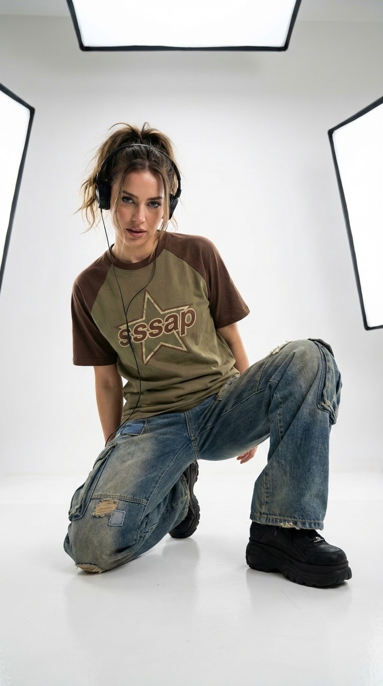 NANO BANANA PROКрупный план лица в студийной съемке с инди-слез стилем и уличной модой. Контраст света и тени, акцент на прическе, наушниках и очках, образ дерзкой эстетики.