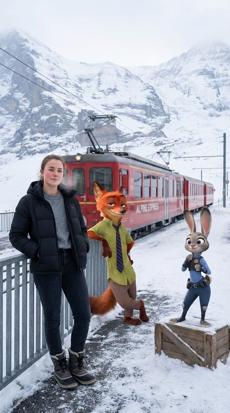 NANO BANANA PROКинематографичный зимний кадр на альпийской станции с молодой женщиной и анимационными персонажами. Реалистичная текстура снега, мягкое освещение, спокойная атмосфера кадра.