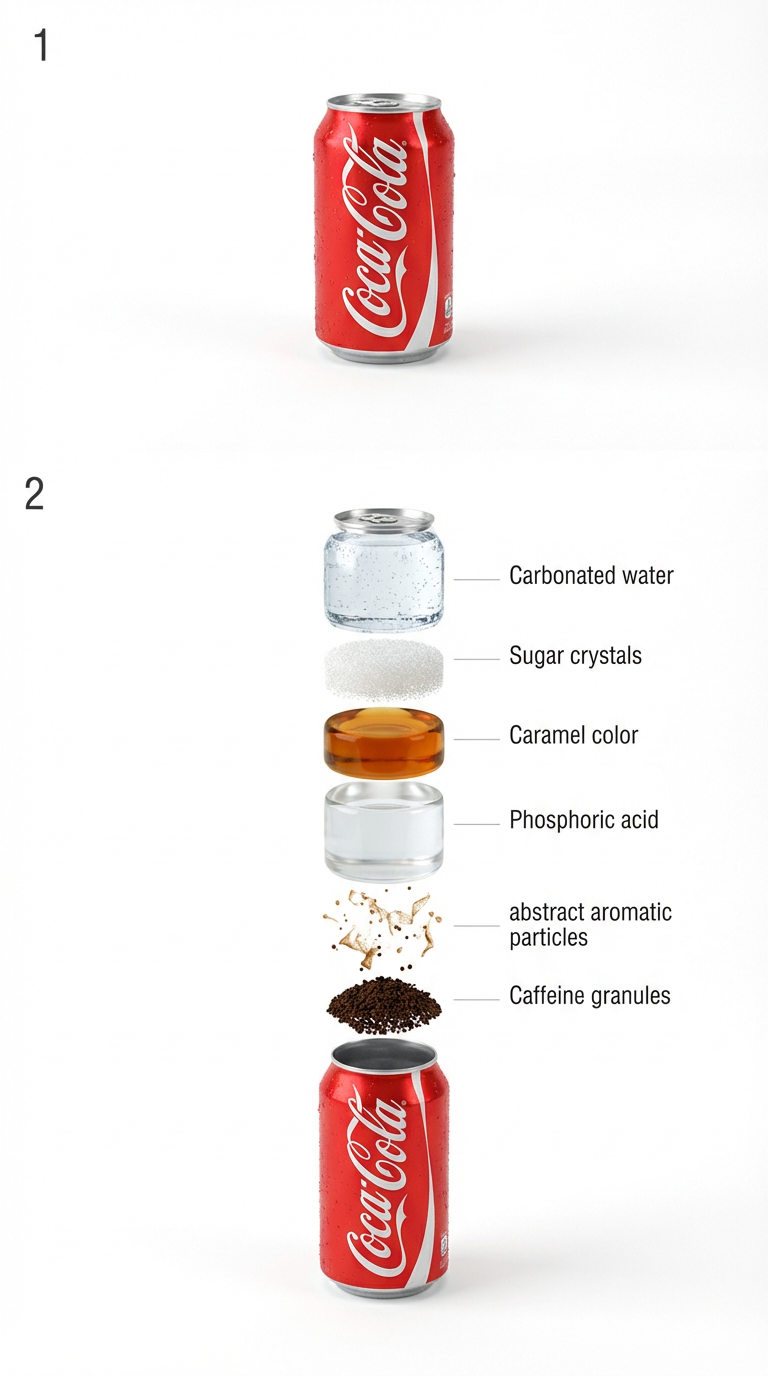 NANO BANANA PROСтильный промпт для фотосъемки банки Coca-Cola на белом фоне и минималистичной инфографики ингредиентов. Акцент на конденсат, глянцевый металл и чистые тени.