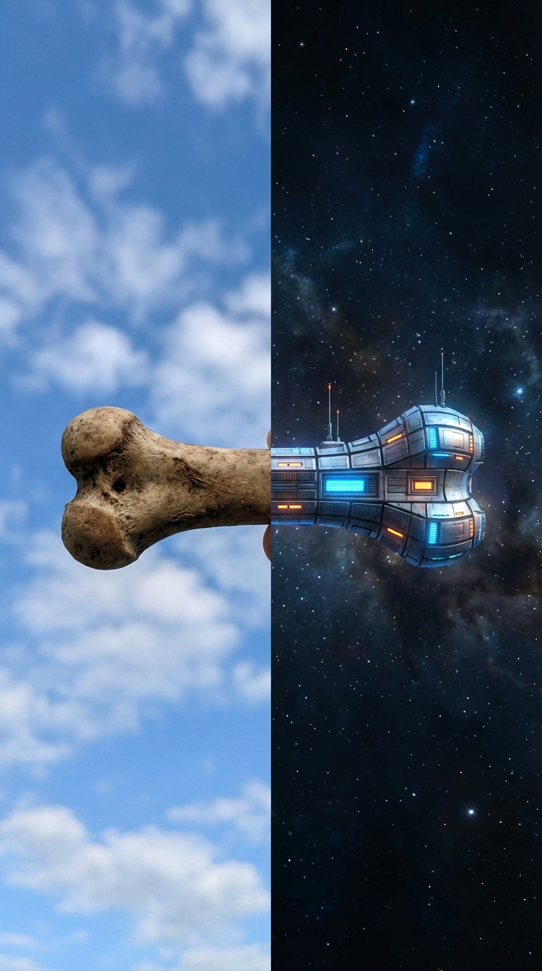 NANO BANANA PROФотореалистичный кадр пополам: кость превращается в футуристический космический корабль. Мягкий переход подчёркивает гармонию органики и техники на космическом фоне.