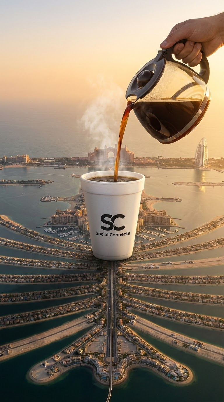 NANO BANANA PROАэрофотосъемка Дубая: гигантская белая чашка на пальме с логотипом SC, в неё наливают кофе. Сцена освещена закатным светом, отражения воды подчёркивают сюрреализм.