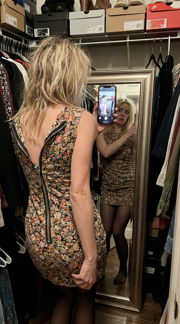 NANO BANANA PROСитуационный промпт о платье с молнией и примерке в зеркале в условиях тусклого света. Акцент на посадке, образ и готовность к вечернему выходу.