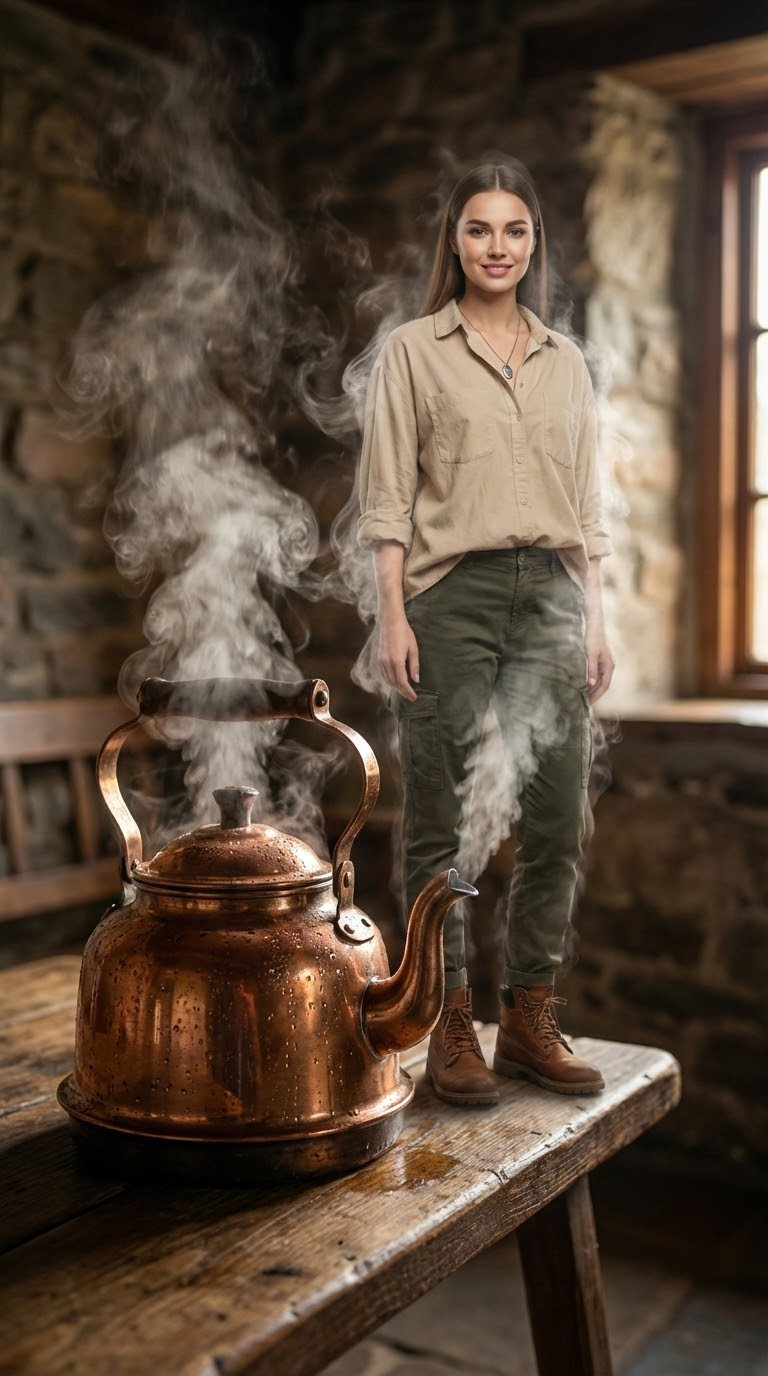 NANO BANANA PROФотореалистичный кадр чайника на скамье с кинематографическим светом. Подробные текстуры металла, капли конденсата и пар создают реалистичную сцену, где паровая фигура выглядит узнаваемо.