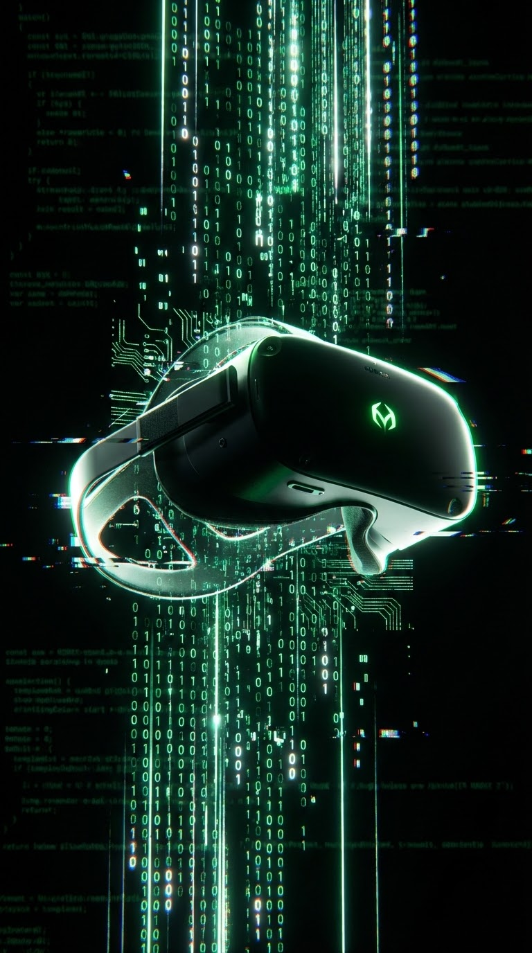 NANO BANANA PROПромпт о летающем продукте в цифровой пустоте, окружённом зелёными кодовыми потоками и глитч-искажениями. Фон черный, контурное освещение зелёным и белым; стиль матрица, 8K рендер и высокая резкость.
