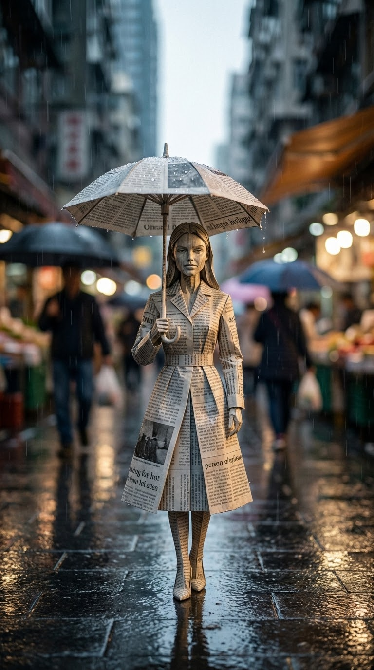 NANO BANANA PROКинематографичный натюрморт на мокрой улице под дождём: бумажная фигура в кадре с выразительной фактурой бумаги. Свет и боке подчеркивают композицию.