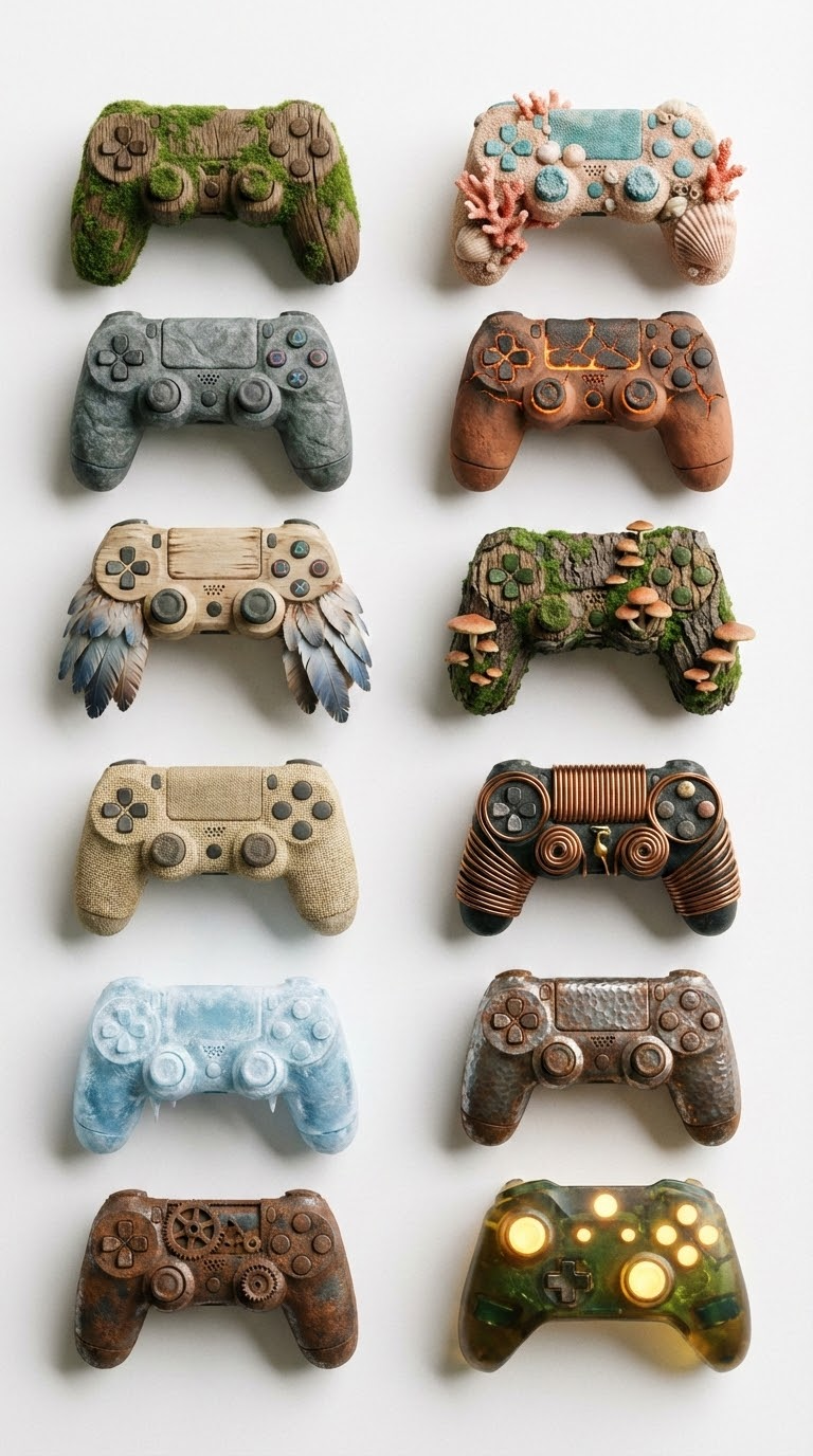 NANO BANANA PROКоллекция игровых контроллеров в сетке 3x3 на белом фоне. Арт-3D стиль передает тактильность и разнообразие геймпадов без текста.