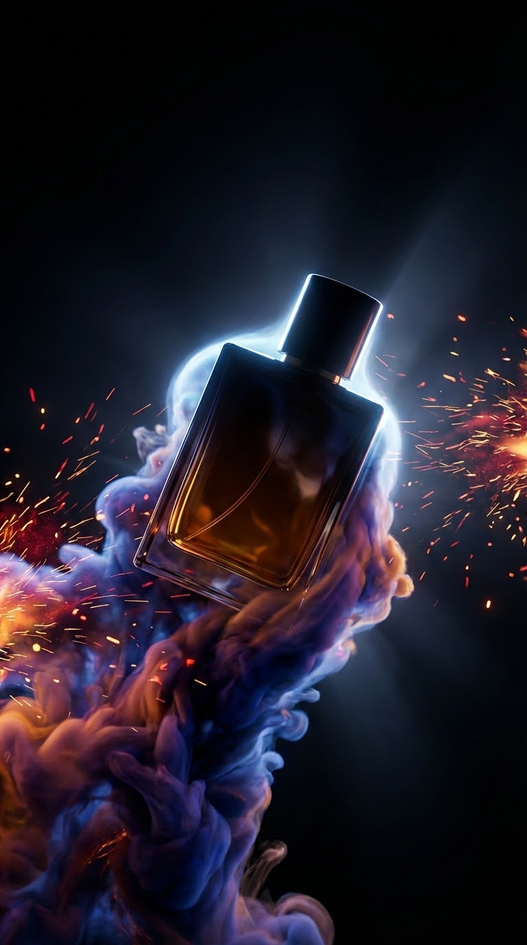 NANO BANANA PROПромпт описывает продукт, выходящий из вихря цветного дыма и искр. На черном матовом фоне создаётся динамичная композиция с парящими искрами и выразительной подсветкой.