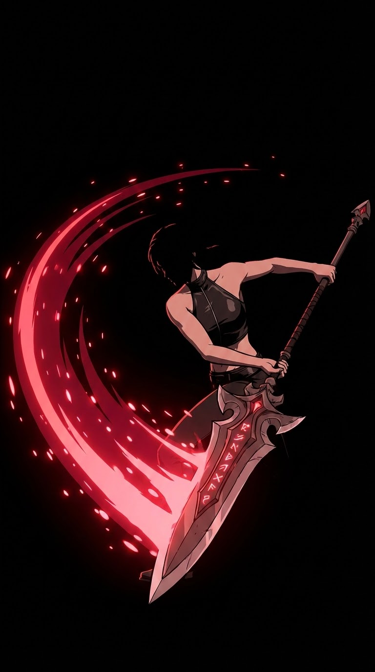 NANO BANANA PROЭпичная битва оружием в стильной сцене с драматическим светом. Красная дорожка клинка и искры вокруг оружия подчеркивают мощный размах и энергию боя.